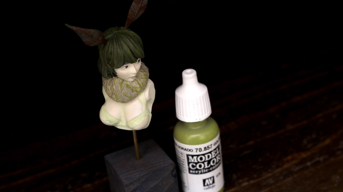 影の色は、ハイライトの色はどうすればよいのだろう。いったい、どれくらいの精度でこの気づきを適用すればよいのだろう。そう思うとクラクラしだす。ブーツの黒に、茶色を混ぜたあたりで「ああ、さらに発展したな」と感づいた。スプリットコンプリメンタリー配色だ。厳密な補色を使わずに、好みで黄緑を塗っていて、ラッキーだった。感覚が理論で補強されて、力強く推進するための助けになる。面白すぎる。
