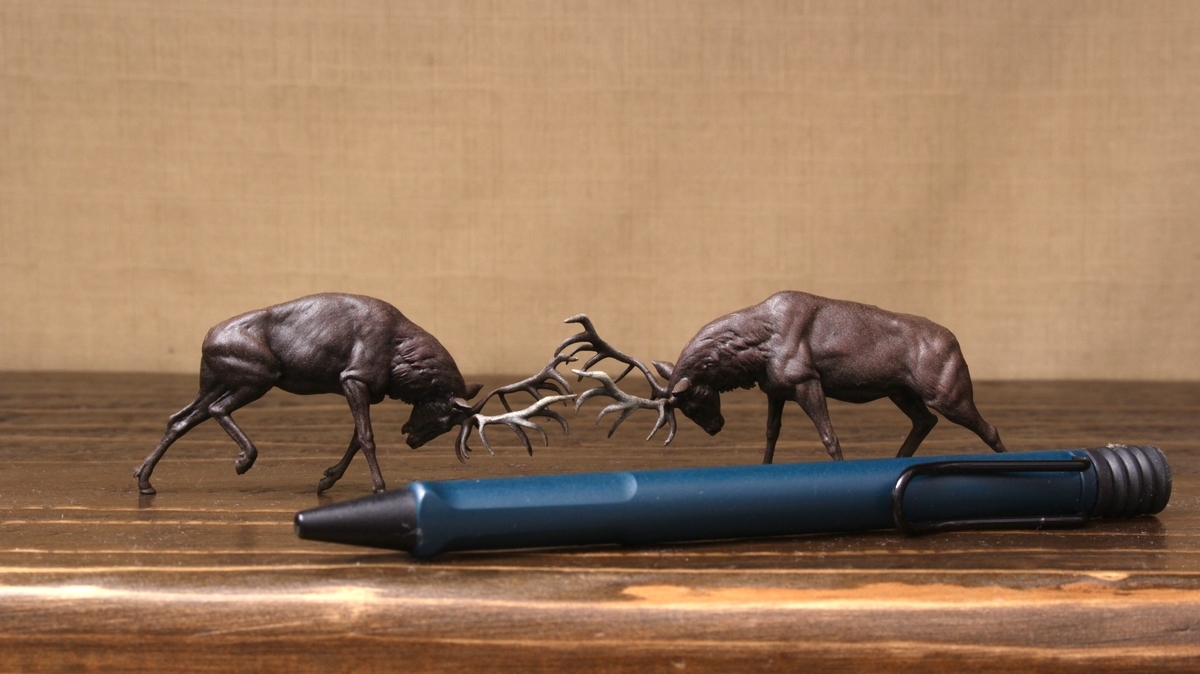私は牡鹿が角をぶつけ合って争っている場面を切り取ったものを買ったけど、他にも良いものがある。どういう形であれ、自分が納得した仕上がりの動物のミニチュアが部屋にあるのは最高だ。